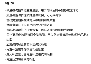 - Axial piston variable displacement pump with swashplate design for hydrostatic transmission in closed circuits - Flow rate is proportional to drive speed and displacement, enabling stepless adjustment